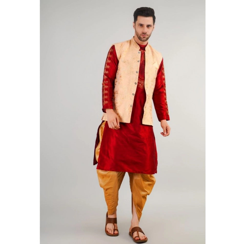 Men's jacquard self-design sleeveless waistcoat in beige features luxurious jacquard fabric with a unique self-design pattern, sleeveless style, and mandarin neck. It's a stylish waistcoat perfect for formal and festive occasions.