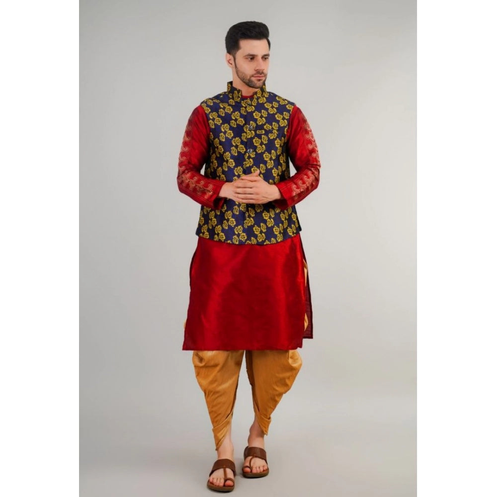 Men’s jacquard self-design waistcoat in blue-gold features luxurious jacquard fabric, striking self-pattern, sleeveless style, and mandarin neck—an elegant and versatile option for formal or festive occasions.