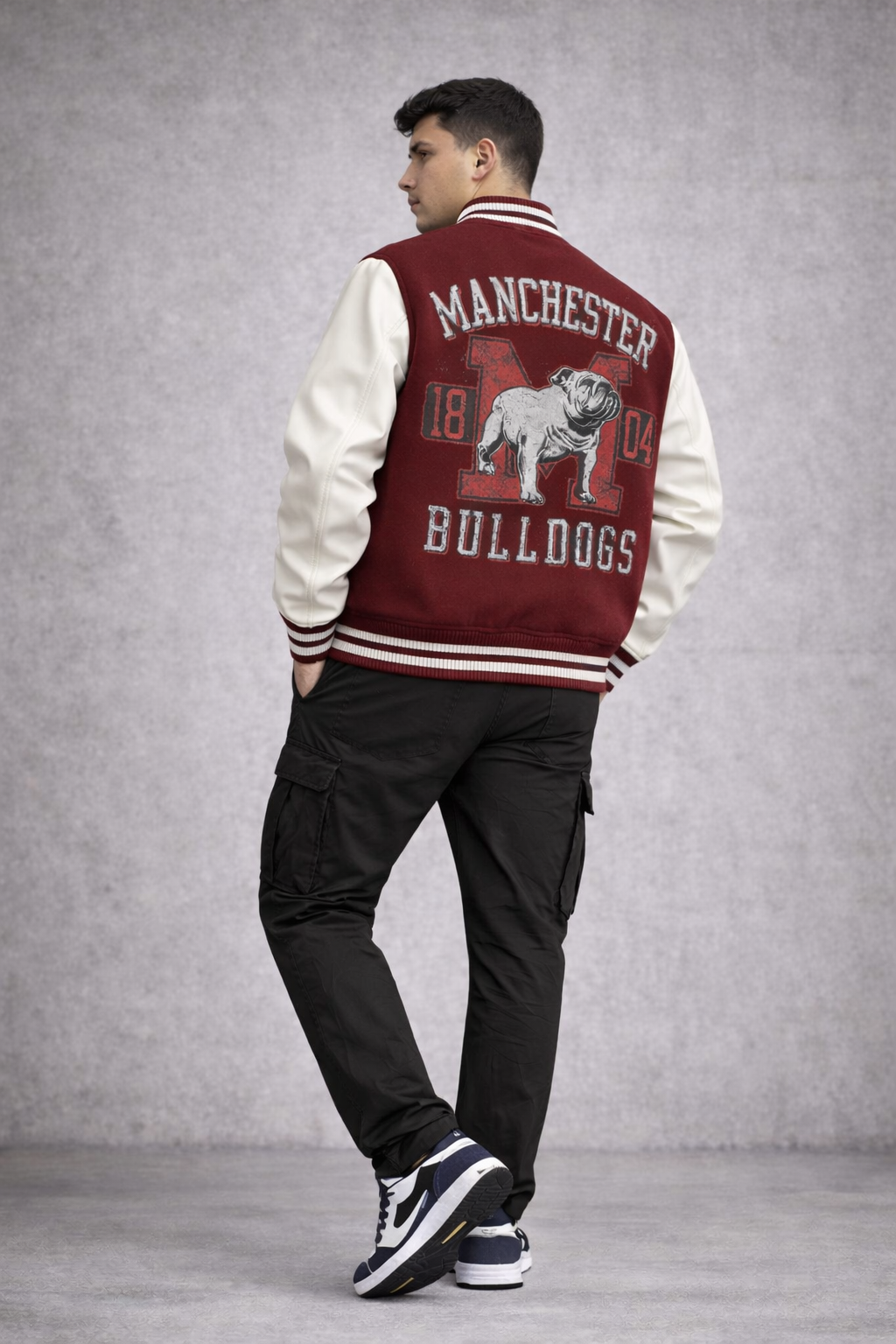 DRIPZY Unisex Varsity Jacket with Bulldogs print. Crafted from 100% cotton 300 GSM fabric and a classic varsity fit, delivering premium comfort and bold athletic streetwear style.