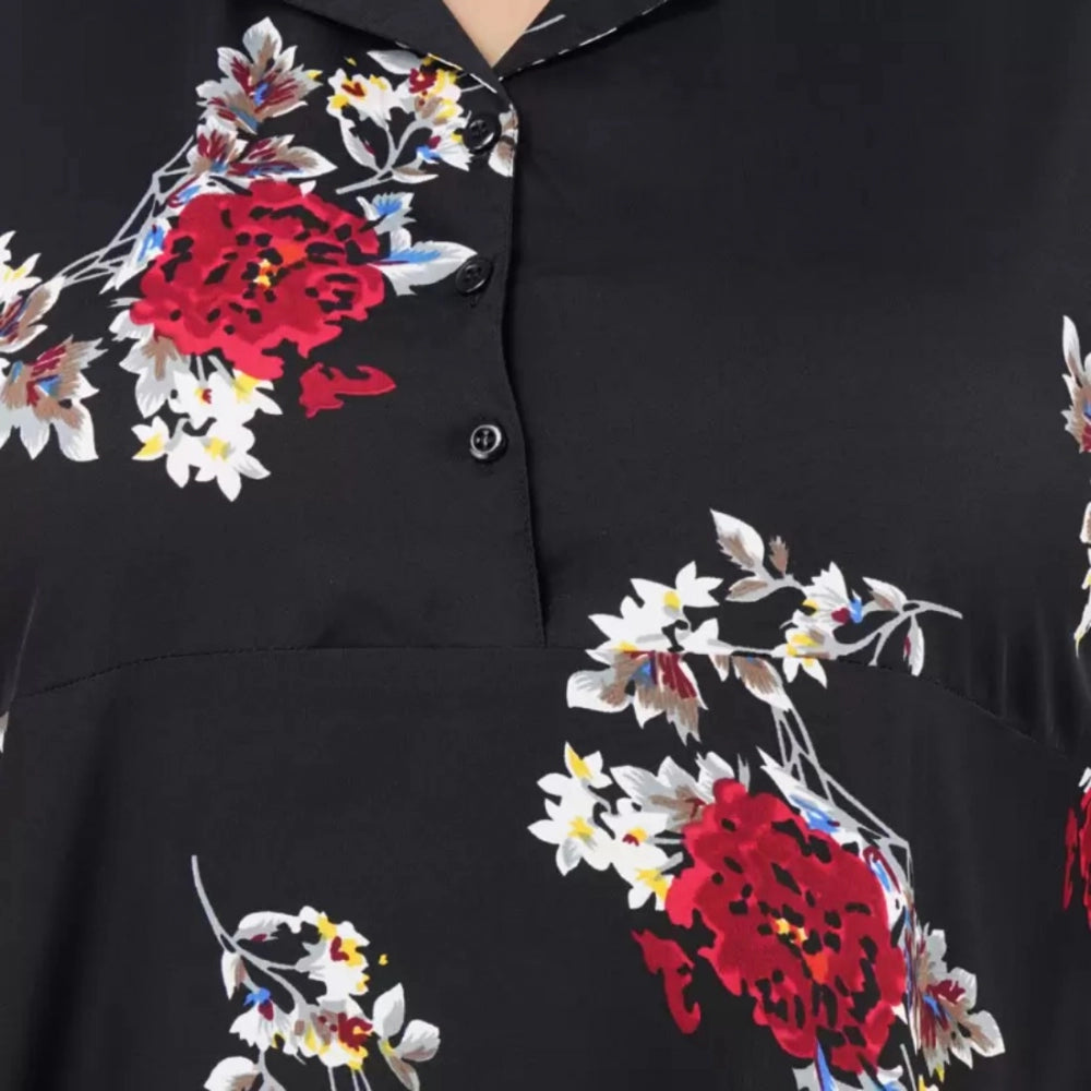 Generic women's fit and flare black dress made from polyester fabric with a collar neck and short sleeves. Polyester is a durable, wrinkle-resistant fabric that is easy to care for. The dress features a smooth texture with a flattering silhouette ideal for casual occasions.