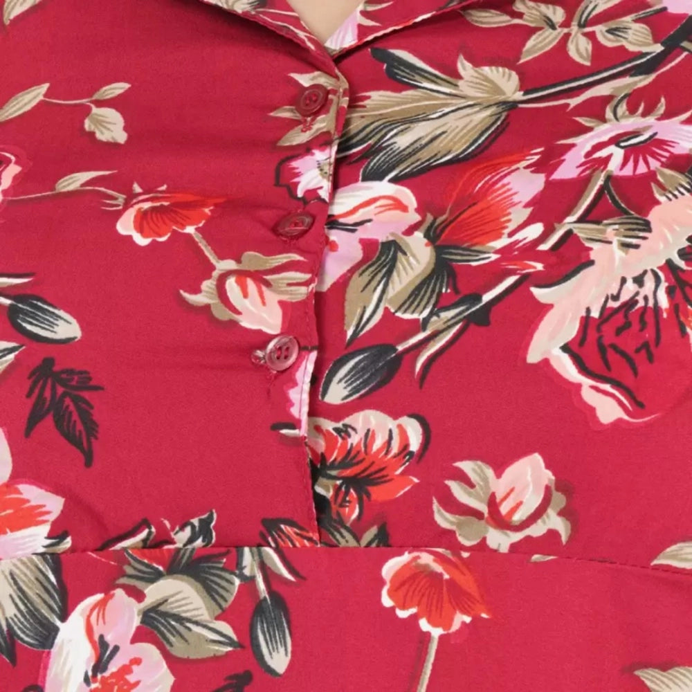 Generic women's fit and flare maroon dress made from polyester fabric with a collar neck and half sleeves, suitable for casual occasions.