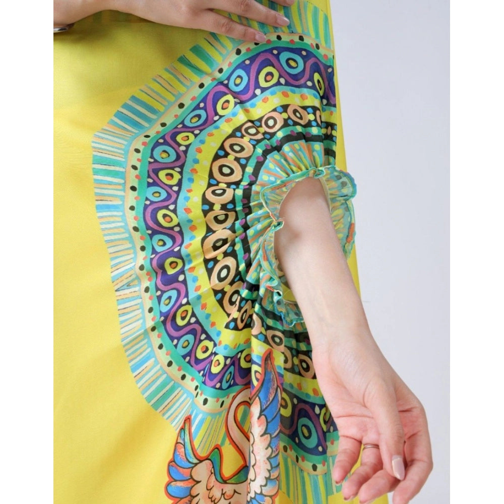 Women's yellow soft crepe silk printed saree measures 5.5 meters in length and comes with an unstitched blouse. The saree features vibrant printed patterns on smooth,