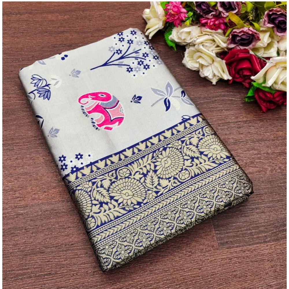 This women's soft litchi silk saree in blue features intricate jacquard work throughout the fabric, offering a luxurious and elegant appearance. It comes with an unstitched blouse, allowing for custom tailoring to achieve the perfect fit. This saree is ideal for weddings, festivals, or special occasions, combining traditional craftsmanship with contemporary style.