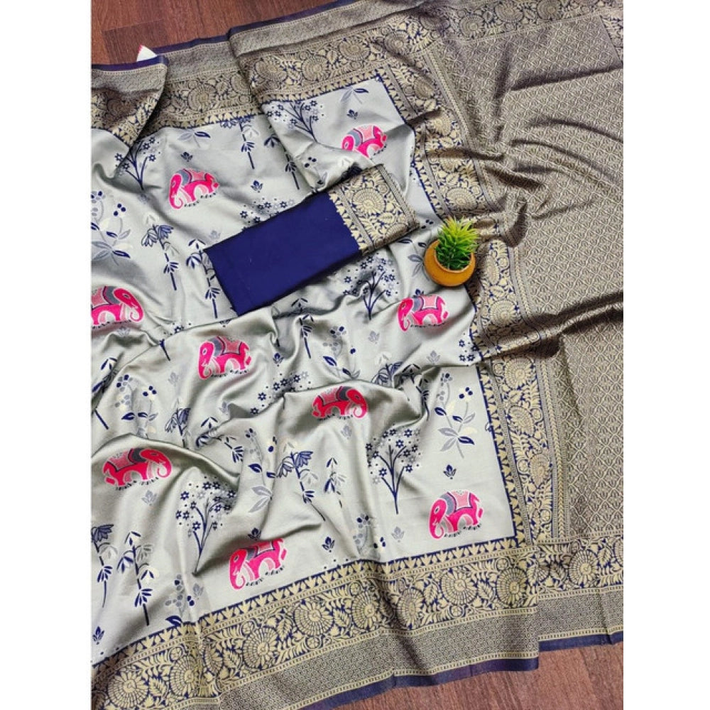 Generic Women's Soft Litchi Silk Jacquard Work Saree With Unstitched Blouse 5.5Mtr (Blue)